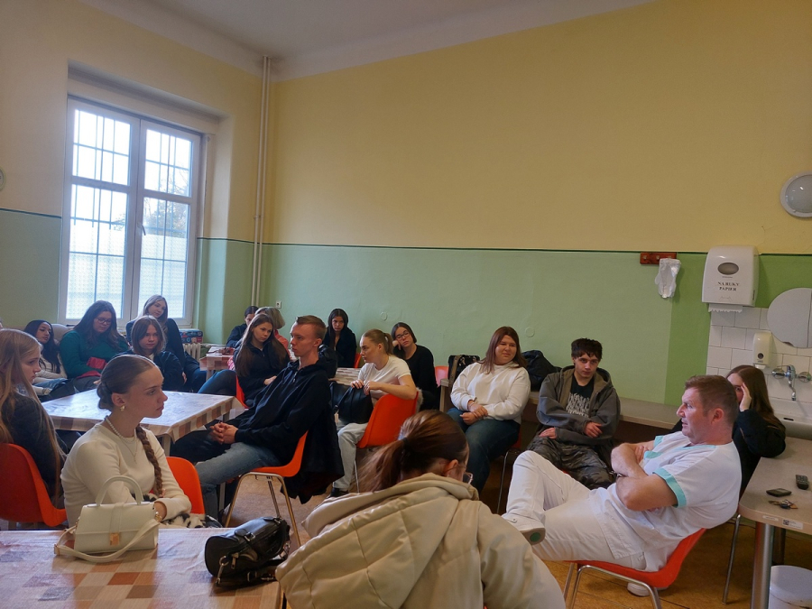 Slavomír Čuj, dipl. vedúca sestra, nás previedol psychiatrickým oddelením a porozprával nám ako zabezpečujú starostlivosť pre pacientov s psychiatrickými poruchami. Medzi najčastejšie dôvody na hospitalizáciu sú závislosti na alkohole, depresie, afektívne poruchy, schizofrénie a psychózy.
